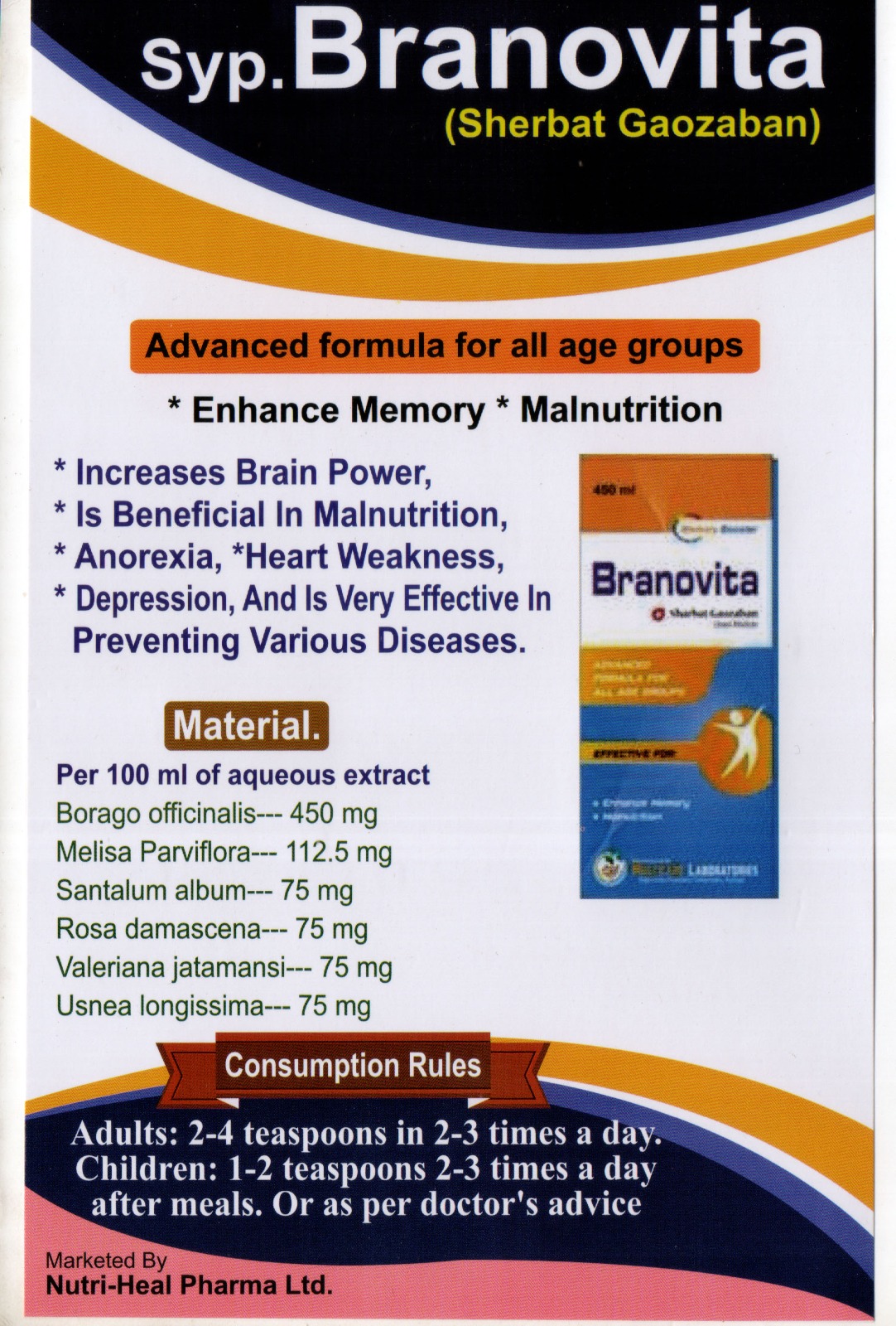 * Increases Brain Power, * Is Beneficial In Malnutrition, * Anorexia, *Heart Weakness, * Depression, And Is Very Effective In Preventing Various Diseases. 450 ml Branovita Material. Per 100 ml of aqueous extract Borago officinalis— 450 mg Melisa Parviflora— 112.5 mg Santalum album— 75 mg Rosa damascena— 75 mg Valeriana jatamansi— 75 mg Usnea longissima— 75 mg
