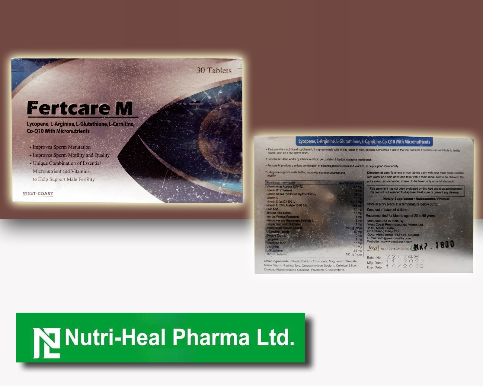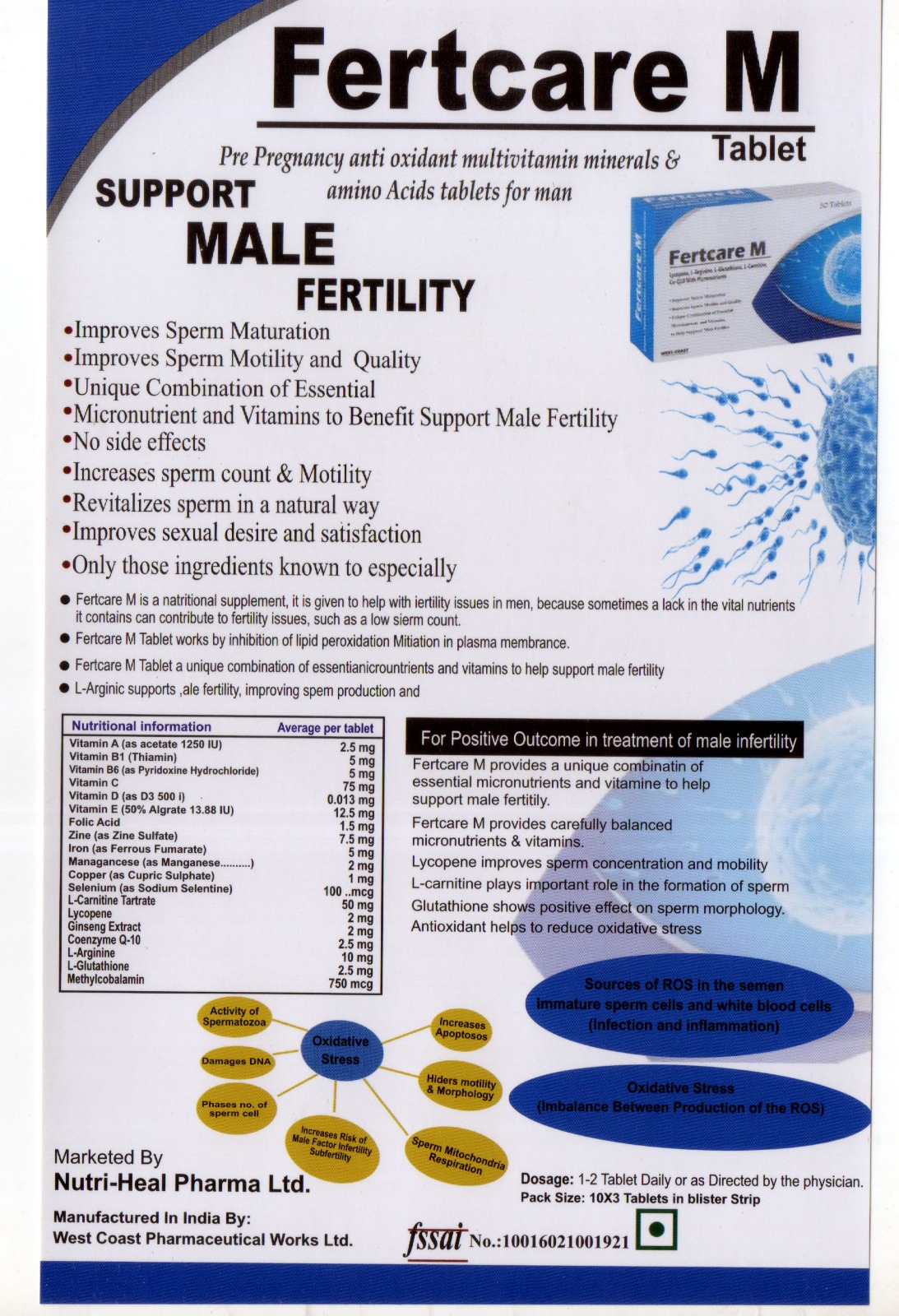 FERTILITY Improves Sperm Maturation Improves Sperm Motility and Quality Unique Combination of Essential Micronutrient and Vitamins to Benefit Support Male Fertility No side effects Increases sperm count & Motility Revitalizes sperm in a natural way Improves sexual desire and satisfaction Only those ingredients known to especially Fertcare M is a natritional supplement, it is given to help with iertility issues in men, because sometimes a lack in the vital nutrients it contains can contribute to fertility issues, such as a low sierm count. Fertcare M Tablet works by inhibition of lipid peroxidation Mitiation in plasma membrance. Fertcare M Tablet a unique combination of essentianicrountrients and vitamins to help support male fertility L-Arginic supports ale fertility, improving spem production and
