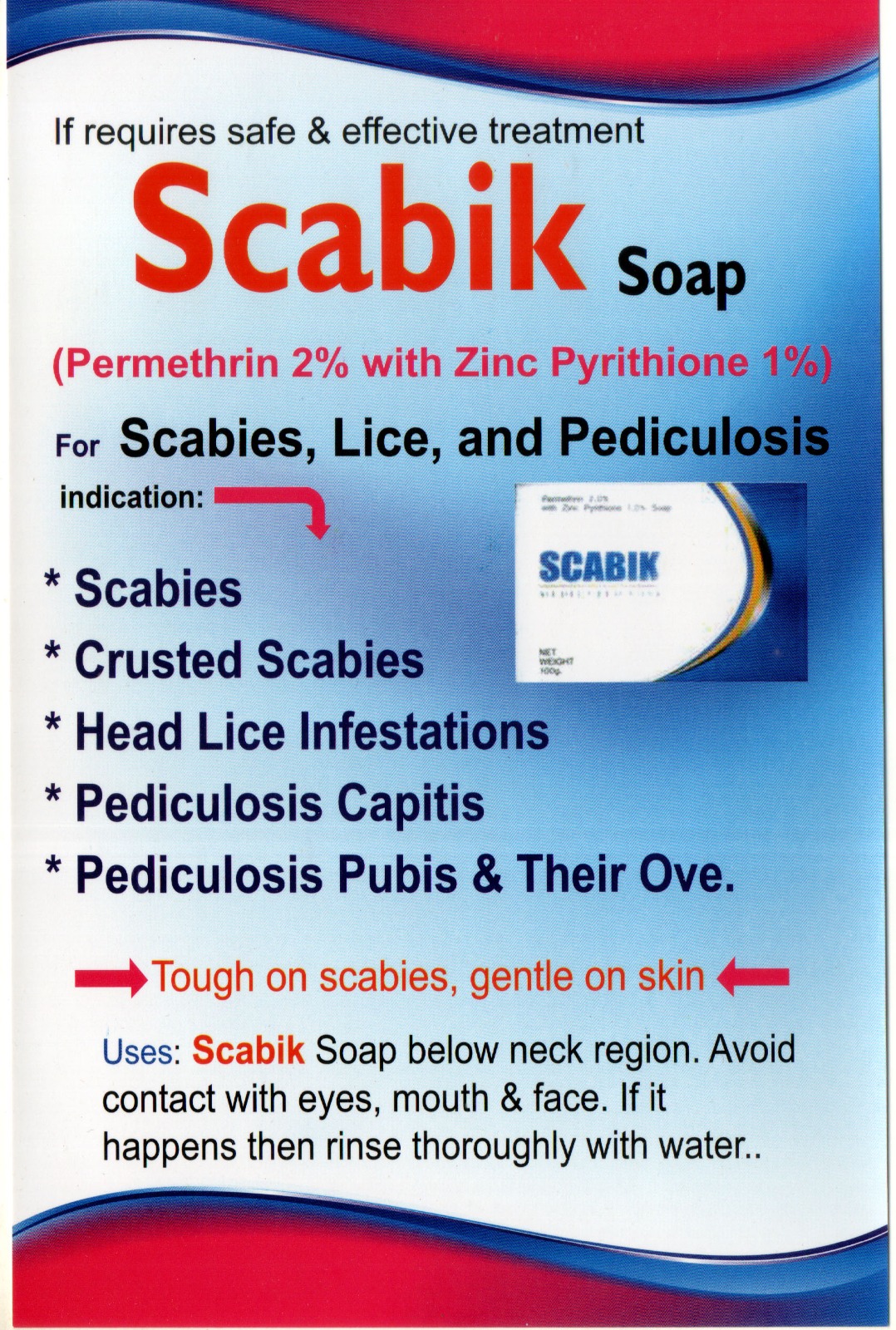 * Scabies * Crusted Scabies * Head Lice Infestations * Pediculosis Capitis * Pediculosis Pubis & Their Ove. Tough on scabies, gentle on skin Uses: Scabik Soap below neck region. Avoid contact with eyes, mouth & face. If it happens then rinse thoroughly with water..